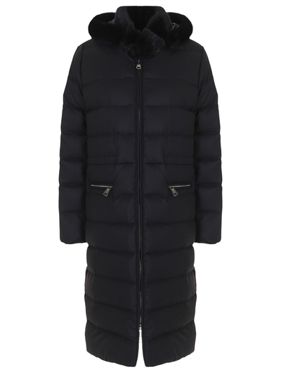 -Модель прямого кроя с длинными рукавами, прорезными карманами на молниях, застежкой на молнию с двумя пуллерами, воротником и капюшоном с отделкой натуральным мехом норки.