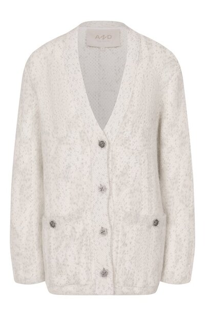 Прямой кардиган связали из смесовой пряжи на основе мохера, шерсти и хлопка с добавлением металлизированных нитей. Модель с приспущенной линией плеч и двумя карманами застегивается брендированными пуговицами.