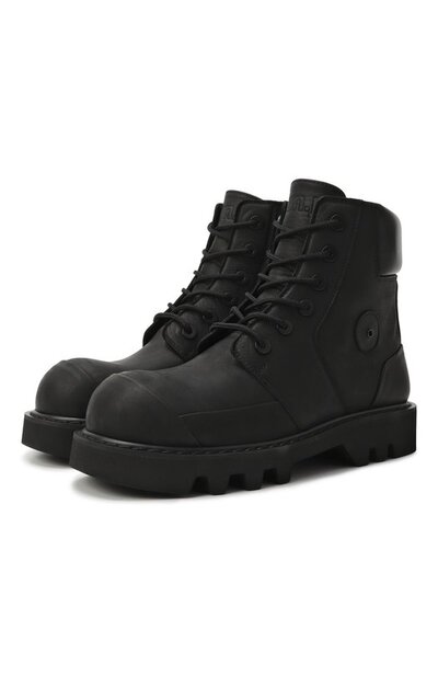 Ботинки с круглым мысом выполнили из гладкой овечьей и фактурной телячьей кожи. Модель, декорированную патчем с люверсом на боковой панели, установили на широкую легкую подошву Vibram с глубоким протектором.