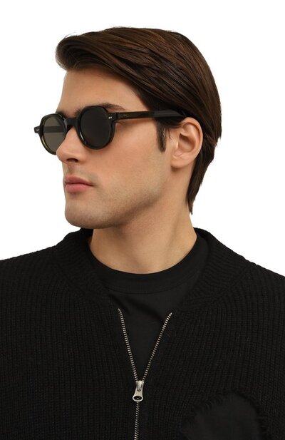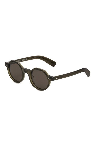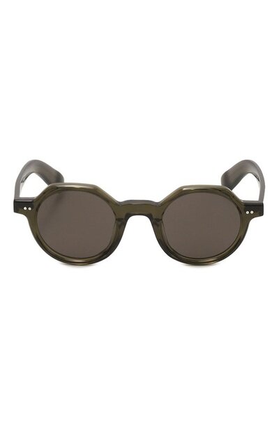 Для изготовления зеленых солнцезащитных очков формы «панто» использовали прочный и при этом легкий ацетат с деликатным блеском. Модель, украшенную миниатюрными заклепками, дополнили темно-серыми линзами, которые нейтрализуют блики и обеспечивают 100% защиты от ультрафиолетовых лучей.