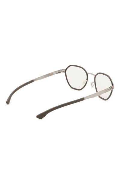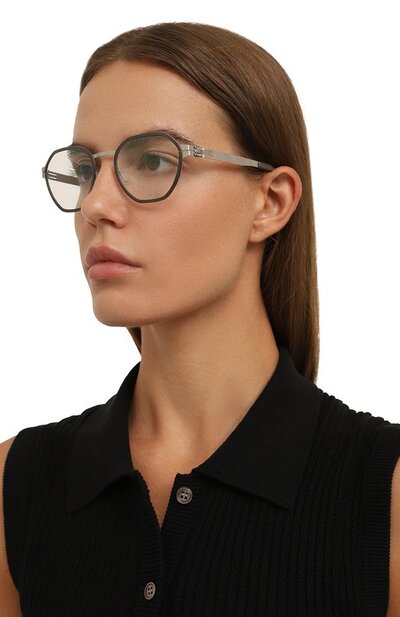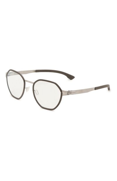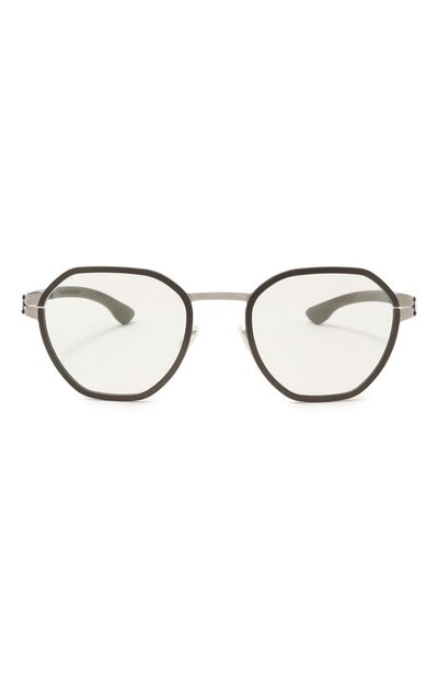 Геометричную форму линз этой узкой оправы подчеркивают накладки из матового серого ацетата. Полимерные детали прячут под собой нержавеющую сталь, которая сделала аксессуар одновременно прочным и легким. Отполированный до гладкости металл остается открытым на мосте и дужках с фирменными безвинтовыми петлями.