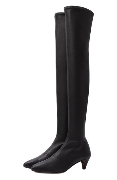 Ботфорты с зауженным мысом и высоким облегающим голенищем сшили из эластичной наппы. Сапоги без декора дополнили фигурным невысоким каблуком.