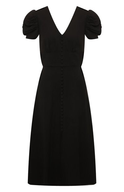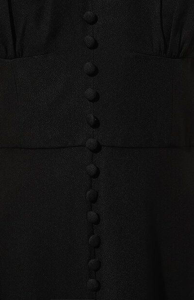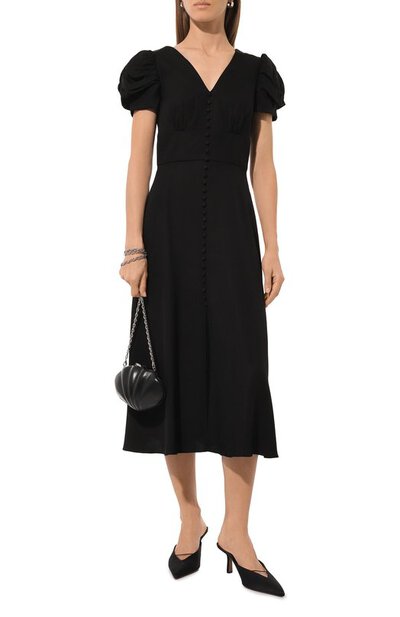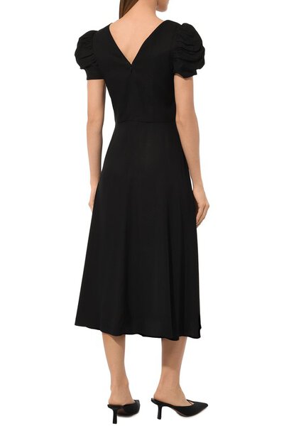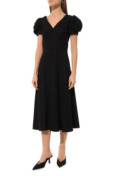 От V-образного декольте черного миди-платья спускается ряд миниатюрных декоративных пуговиц, который переходит в высокий разрез, заметный только в движении. Салони Лодха поддержала романтический тон драпированными короткими рукавами и деликатными складками на приталенном лифе. Модель из струящегося вискозного крепа застегивается потайной молнией на спинке.