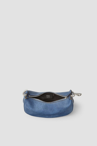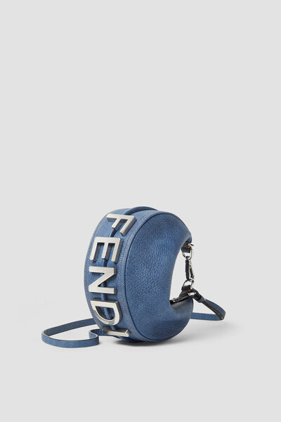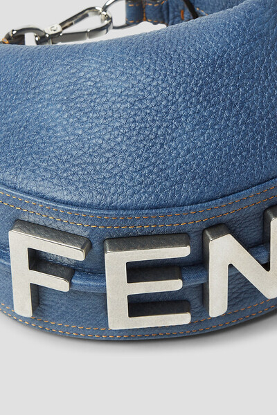 Актуальная синяя сумка-хобо Fendigraphy мини-формата. Модель изготовлена из мягкой кожи телёнка Cuoio Romano с отделкой, создающей эффект денима. Изделие отличается зернистой поверхностью, полученной благодаря особому процессу дубления без использования металлов, и наличием одного просторного внутреннего отделения. Аксессуар интересен прострочкой на швах и крупным винтажным логотипом FENDI из металла с палладиевым покрытием в нижней части, видимым, когда сумку носят под мышкой.