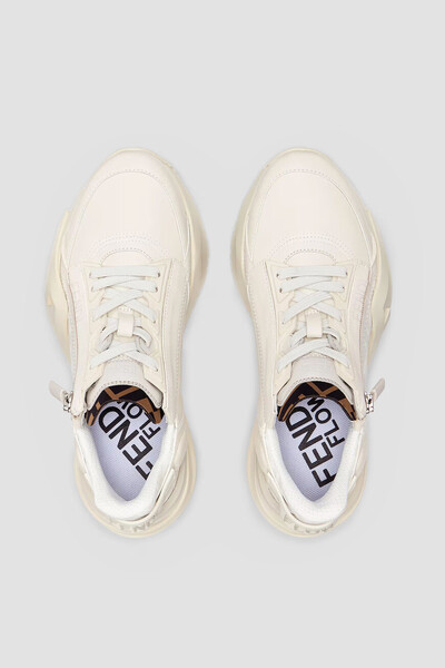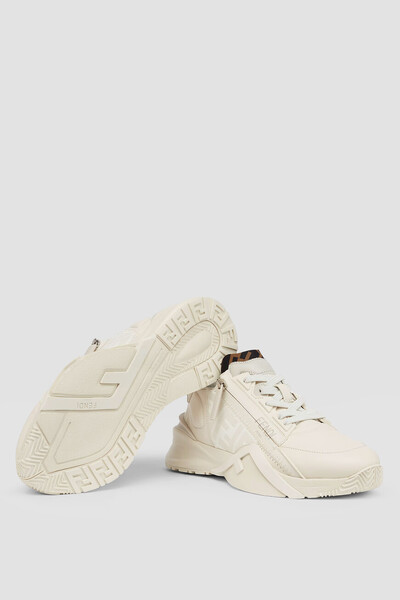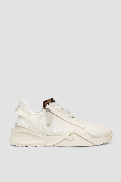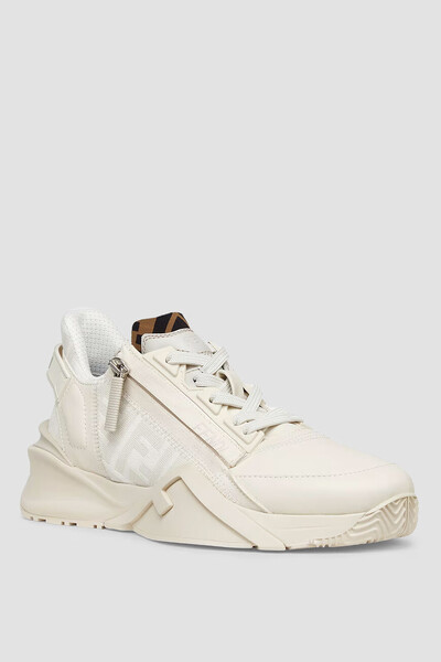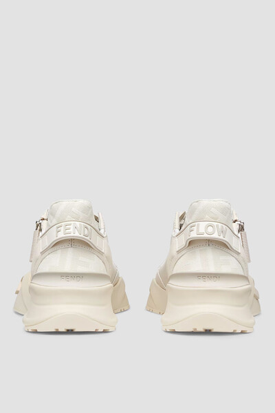 Белые сникеры-слипоны Fendi Flow с закрытой перекрёстной шнуровкой. Для изготовления изделия с укреплёнными округлым носком и задником выбраны гладкая кожа телёнка, прочный полимер и ткань на основе хлопка и нейлона с геометрическим мотивом «FF» на боковинах и в задней части пары. Застёжка-молния с брендированной планкой сбоку гарантирует удобство надевания.