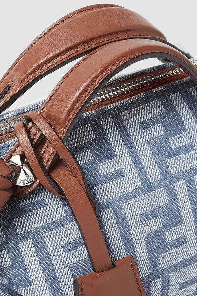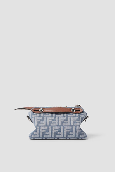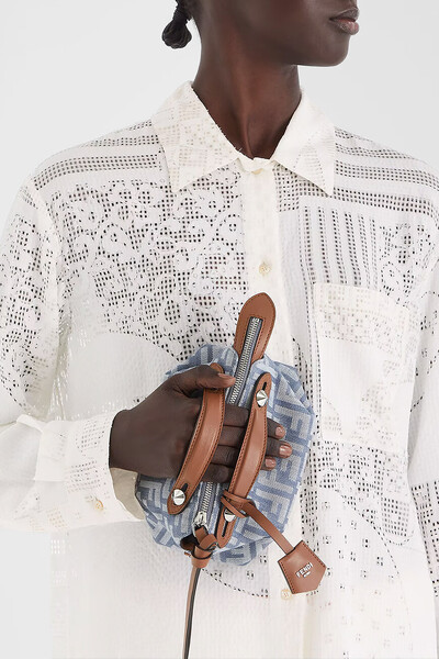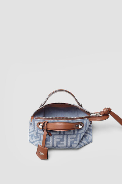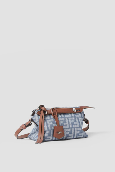 Сумка-мини By The Way Soft от бренда Fendi с двумя вариантами для переноски. Поверхность легендарной модели из плотного синего текстиля с эффектом денима покрыта геометрическим жаккардовым мотивом «FF» голубого оттенка в крупном начертании. Характерными особенностями аксессуара являются отделка из мягкой телячьей кожи коричневого цвета и металлическая фурнитура с палладиевым покрытием. А роли атрибута Дома выступает персонализируемая подвеска на одной из ручек.