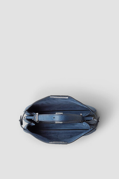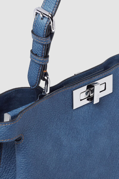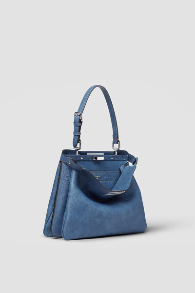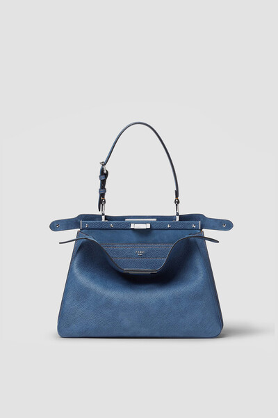Сумка Peekaboo Soft от бренда Fendi с двумя просторными внутренними отделениями. Для производства легендарного аксессуара среднего формата выбрана мягкая телячья кожа Cuoio Romano синего цвета с отделкой, создающей эффект денима. Одной из особенностей модели стала зернистая поверхность, полученная благодаря особому процессу дубления без использования металлов. Изделие с мягким дизайном, который подчёркивает «улыбку» на передней панели, является воплощением мастерства и креативности Дома.