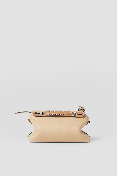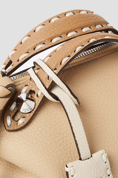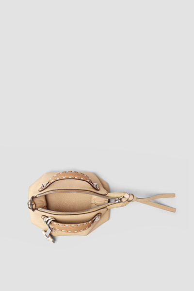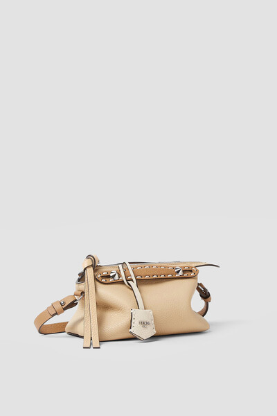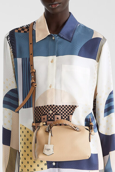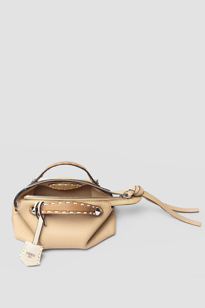 Легендарная сумка-мини By The Way Selleria от бренда Fendi. Для изготовления светло-бежевого аксессуара, прошитого вручную 156 макро-стежками в тон, используется зернистая телячья кожа Cuoio Romano. Модель переосмыслена в новом мягком дизайне и дополнена деталями цвета капучино: двумя плоскими округлыми ручками по бокам и регулируемым плечевым ремнём, предназначенными для переноски.