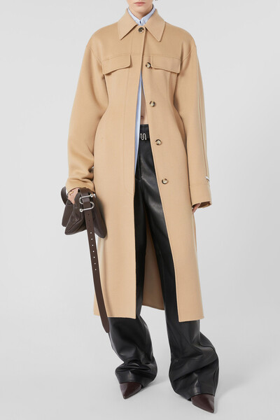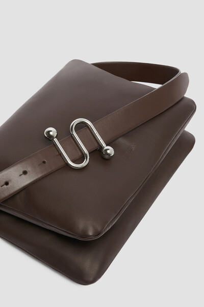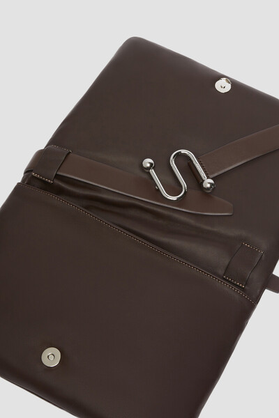 Набивная сумка-конверт от Max Mara с одним просторным внутренним отделением. Для создания небольшого аксессуара выбрана мягкая кожа наппа коричневого оттенка. Принадлежность изделия с откидным клапаном на потайной магнитной застёжке-клёпке Дому обозначена надписью-названием линейки одежды спереди и гравировкой на дизайнерской S-образной пряжке.
