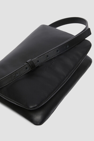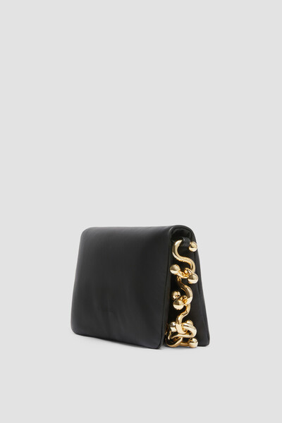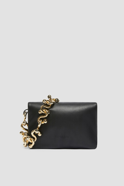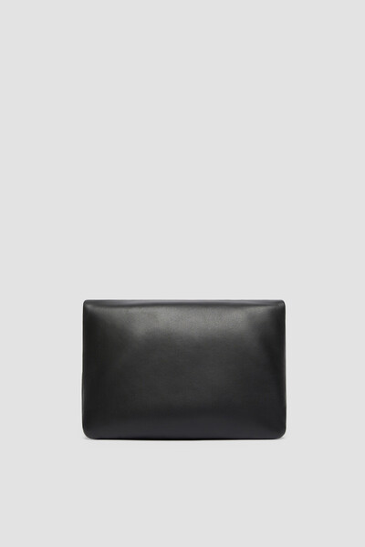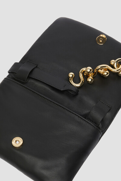 Кожаная сумка-конверт от Max Mara мини-формата. Конструкция изделия чёрного базового цвета предполагает наличие откидного клапана на потайной магнитной клёпке и одного внутреннего отделения для хранения мелких предметов. Отличительными деталями являются съёмные металлическая ручка-цепочка с S-образными элементами светло-золотого оттенка и регулируемый плечевой ремень.