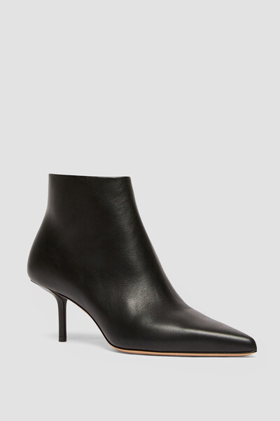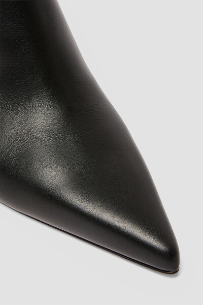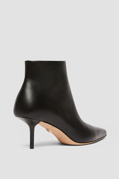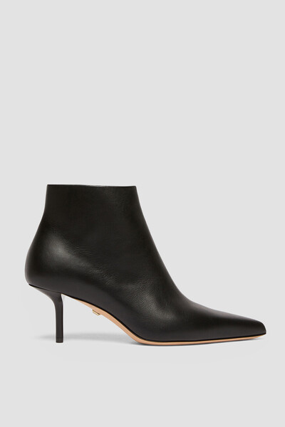 Кожаные ботильоны Max Mara на потайной застёжке-молнии на внутренней стороне. Изделие чёрного цвета выделано изнутри мягкой кожей наппа и установлено на светло-бежевую подошву с высокой устойчивой шпилькой, находящейся в эргономичном положении для лучшей устойчивости. Характерными особенностями удобной пары стали зауженный носок и сглаженный силуэт на подъёме.
