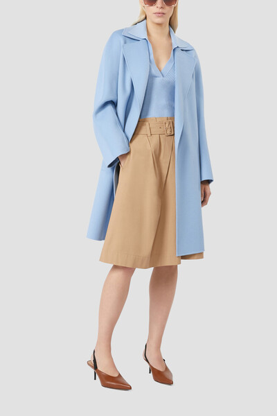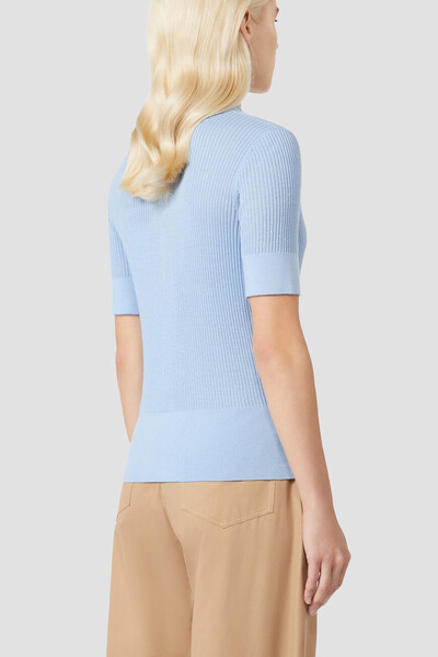 Шерстяное поло Max Mara в небесно-голубом оттенке. Для пошива изделия выбрали смесь шерсти и шёлка, который придаёт деликатное сияние изделию. Отличительным элементом выступают вкрапления пайеток по всей поверхности изделия. Модель отличается свободным кроем и женственным дизайном с изящным V-образным разремом в зоне декольте.
