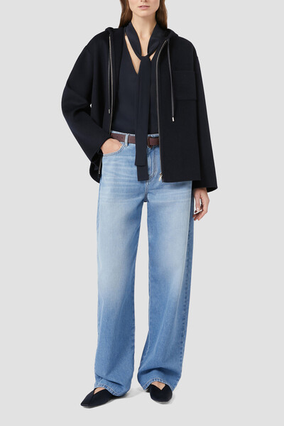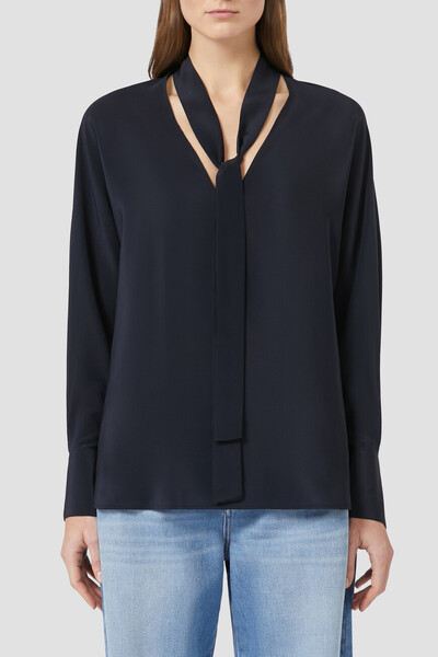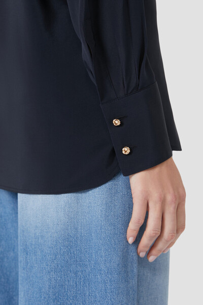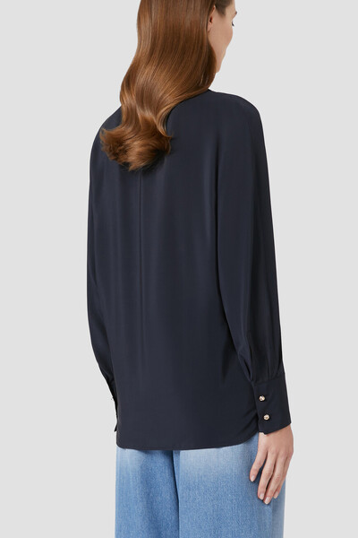 Тёмно-синяя блуза Max Mara из тонкого крепдешина из чистого шёлка, что придаёт ткани мягкость и лёгкий блеск. Лаконичный свободный крой, элегантный вырез и полукруглый подол с разрезами по бокам позволяют носить рубашку как навыпуск в расслабленных образах, так и заправленной – в более строгих.