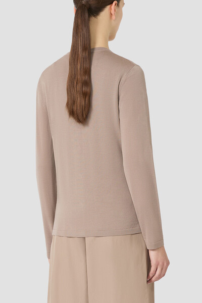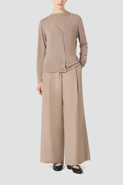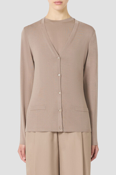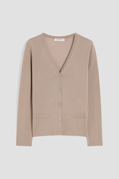 Кардиган Max Mara выполнен из мягкой шерстяной пряжи пыльно розового цвета и олицетворяет утончённую простоту. Лаконичный силуэт в минималистичном стиле не обременён декором, что делает его универсальным предметом гардероба. Широкий V-образный вырез подчёркнут рядом пуговиц, а тонкая текстура вяжется в единый ритм лёгкости и комфорта.