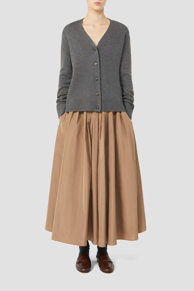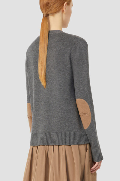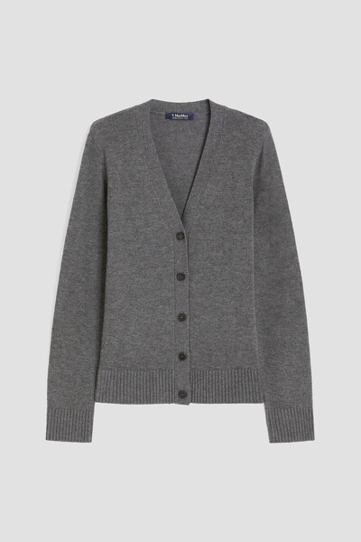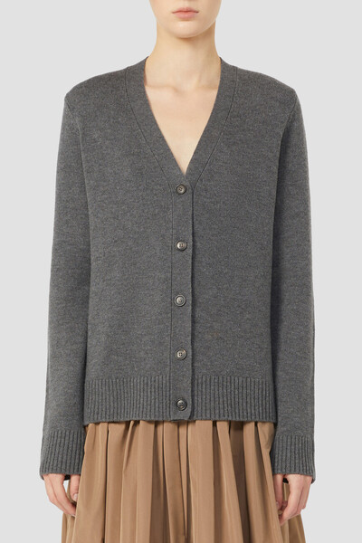 Кардиган Max Mara в глубоких графитовых тонах – пример сдержанной элегантности и утончённого минимализма. Чистый силуэт без лишних деталей подчёркивает лаконичность и плавность линий, а контрастные нашивки-заплатки на локтях с фирменным логотипом создают акцент современности и динамики.