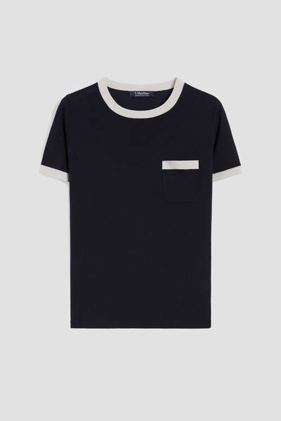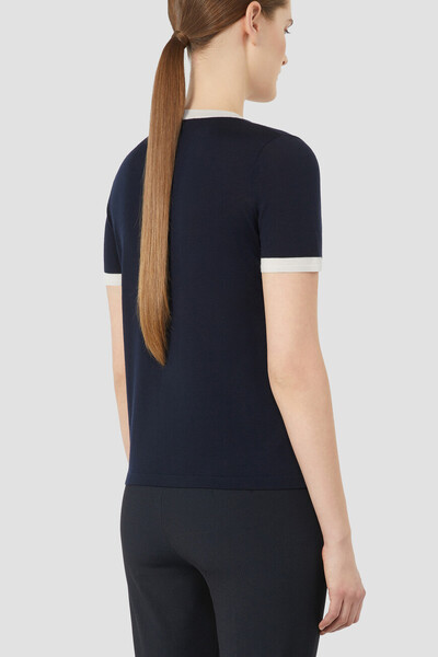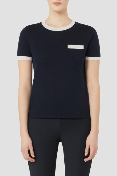 Шерстяной джемпер с короткими рукавами от Max Mara. Изделие в насыщенном ультрамариновом цвете украшает лишь контрастная отделка: горловины, манжеты коротких рукавов и верх накладного кармана на груди выделены белым цветом и создают эффект графичности. Джемпер станет универсальной основой как для повседневных, так и для более изысканных образов.