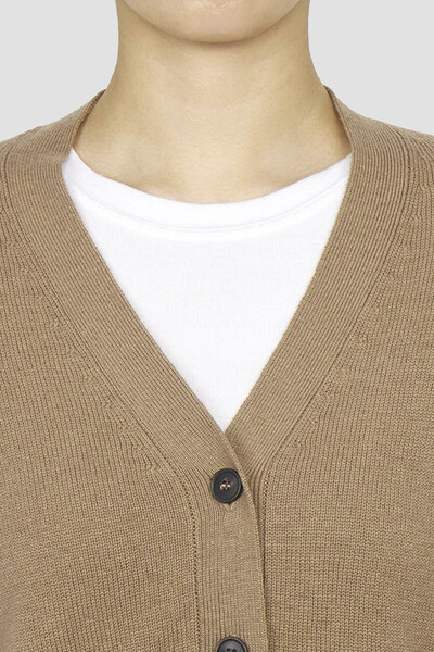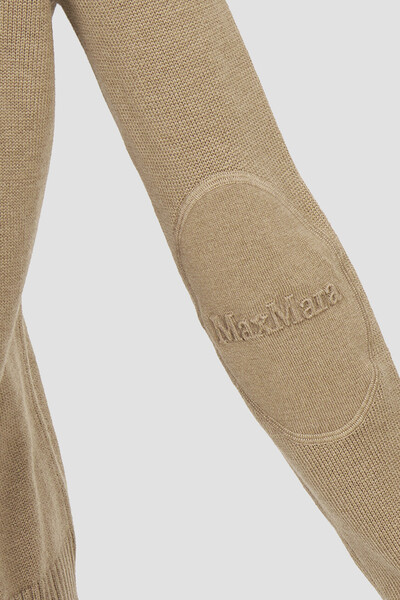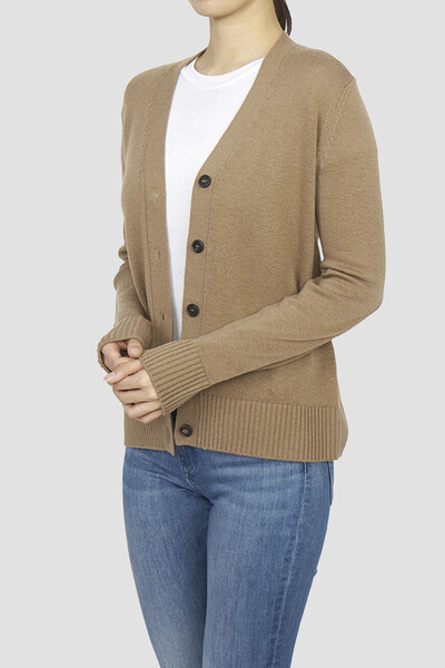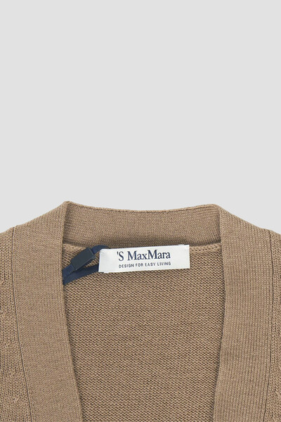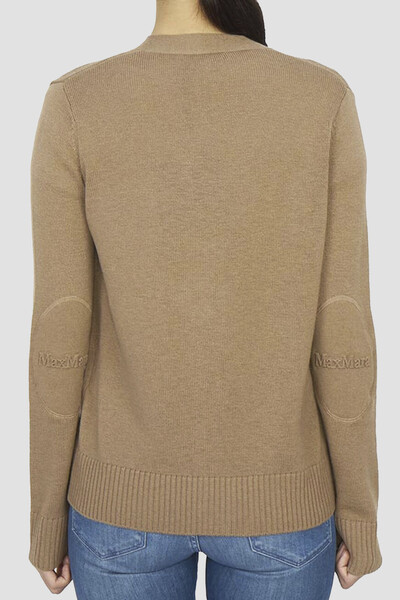 Кардиган Max Mara универсального песочного оттенка. Динамичности изделию придают контрастные роговые пуговицы. Модель из смеси шерсти, кашемира и хлопка мягко облегает фигуру и обеспечивает комфорт и тепло при носке. Отличительной особенностью выступают нашивки на локтях и надписью-названием бренда.