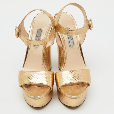 Gold python embossed leather wraps the foot in a sleek ankle strap silhouette. The platform adds height without weight, and subtle metallic shine ensures these sandals feel sculptural yet effortless.