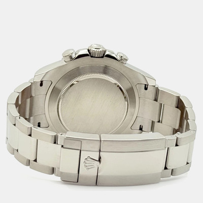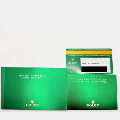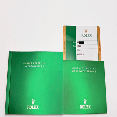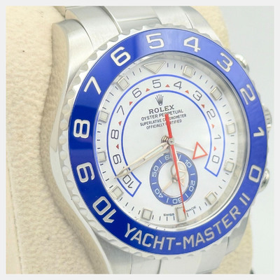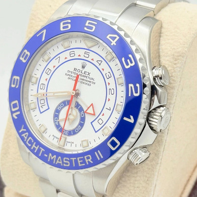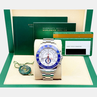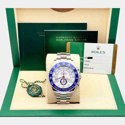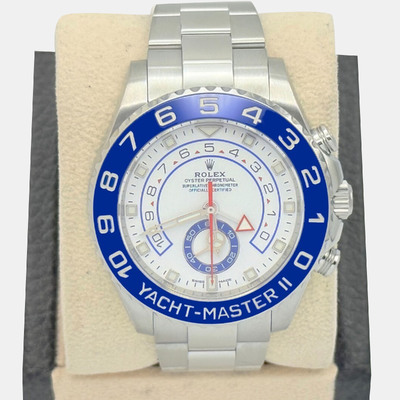 The Yacht Master II 116680 features a 44mm stainless steel case, white dial, and a bright blue ceramic bezel. This model includes a programmable countdown timer and is built for regatta racing, combining sport functionality with classic Rolex craftsmanship.