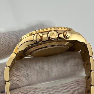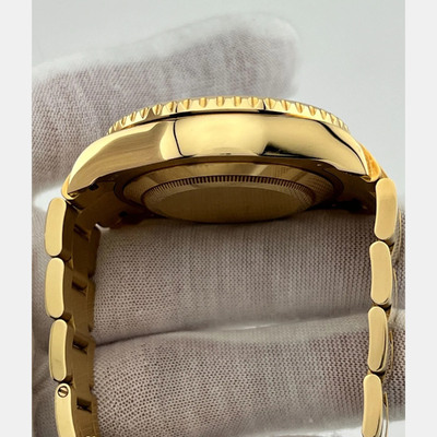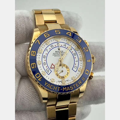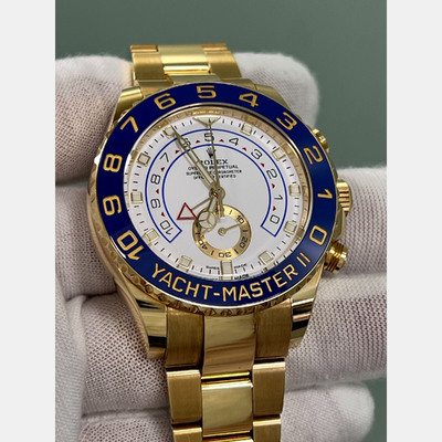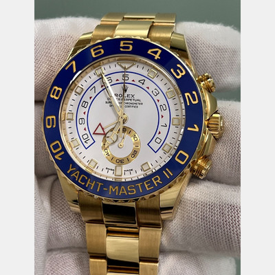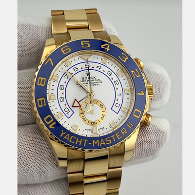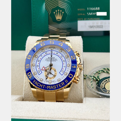 Crafted in 18K yellow gold, the Rolex Yacht Master II 116688 stands out with its blue ceramic bezel and white dial. At 44mm, this model includes advanced regatta timing features and a bold presence on the wrist.