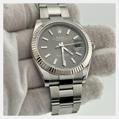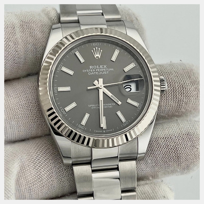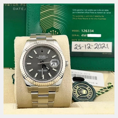 The Rolex Datejust 126334 features a slate rhodium dial inside a 41mm stainless steel case with a white gold fluted bezel. Automatic movement and a brushed Oyster bracelet complete its versatile, everyday appeal.