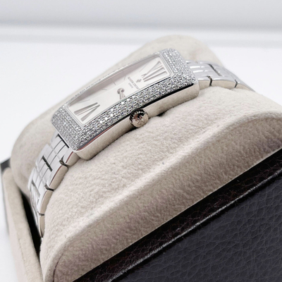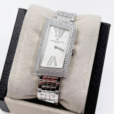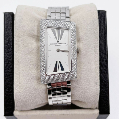 This Vacheron Constantin Cambree features a slim, asymmetric design crafted from 18K white gold. With quartz movement and a compact 21mm case, it’s designed for those who prefer a lightweight, elegant women’s timepiece.