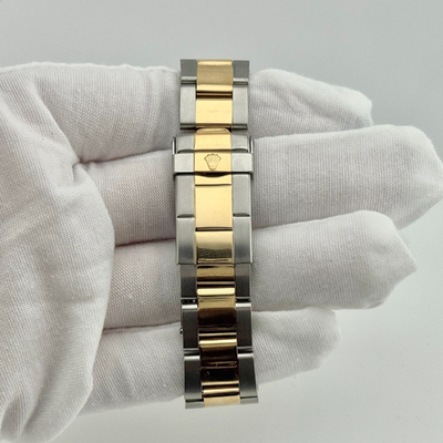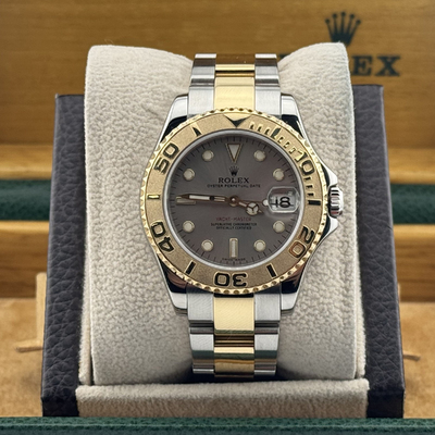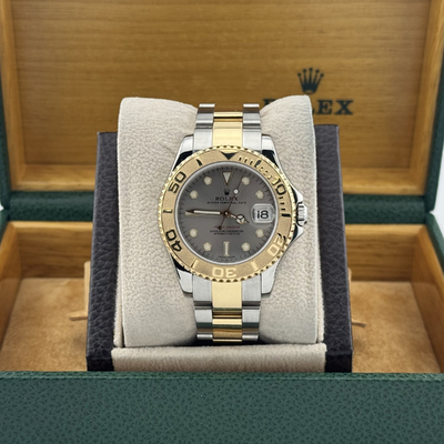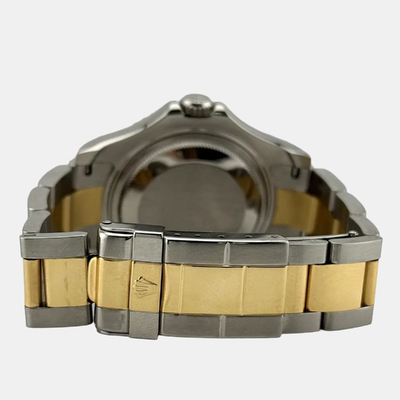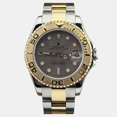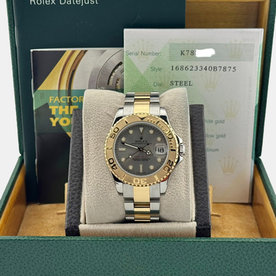 Elegant and versatile, the midsize Rolex Yacht Master 168623 blurs the lines between sport and style. Its silver toned dial reflects both light and finesse, housed within a warm embrace of yellow gold and steel. At 35mm, it offers a refined presence on the wrist—neither overtly bold nor demure. This is a timepiece designed for women who navigate the world with poise and precision.