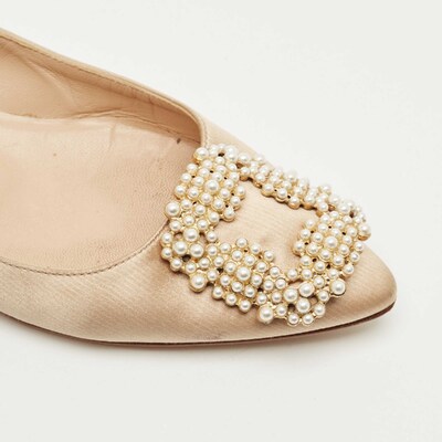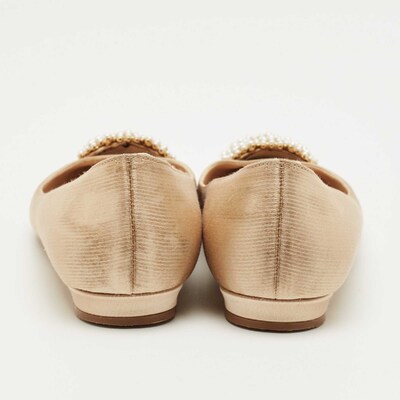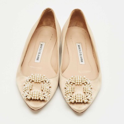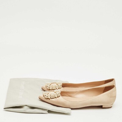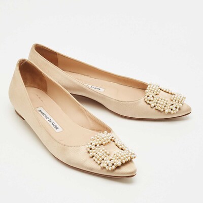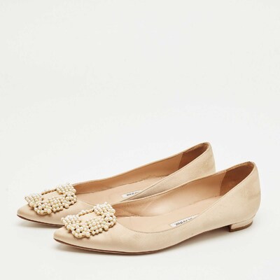 Rendered in soft beige satin, these ballet flats are adorned with the iconic buckle that defines the Hangisi line, only this time its faux pearls instead of crystals. Their delicate silhouette and shine make them a graceful choice for both special occasions and daily wear.