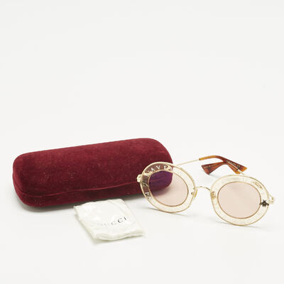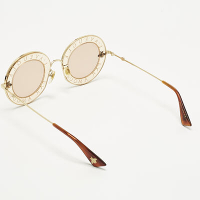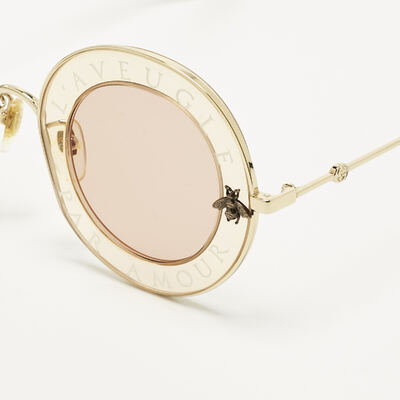 Gucci’s round GG0113S sunglasses in yellow and pink embrace the house’s playful “L’Aveugle Par Amour” mantra across the rim. The vibrant palette and bold lettering turn eyewear into a collectible accessory. Pair them with a simple outfit to let the glasses speak for themselves.
