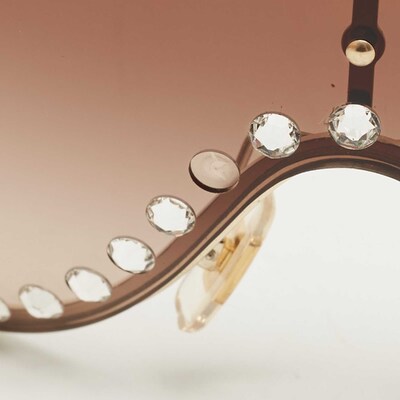 Miu Miu’s crystal shield sunglasses combine a brown gradient lens with sparkling accents along the rim. Oversized yet lightweight, they offer both coverage and glamour. A statement piece for city strolls or resort holidays.