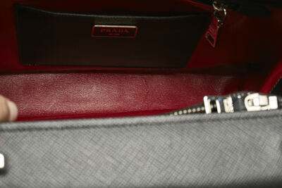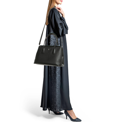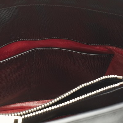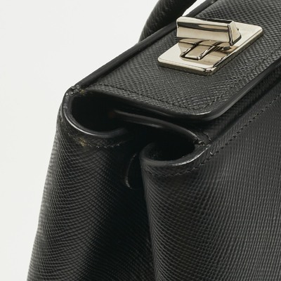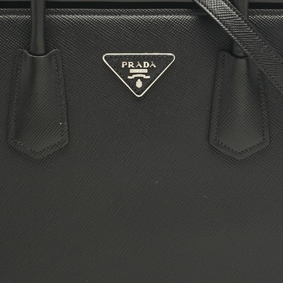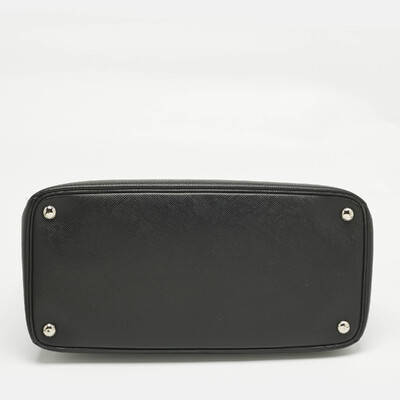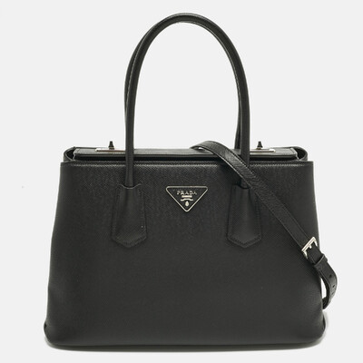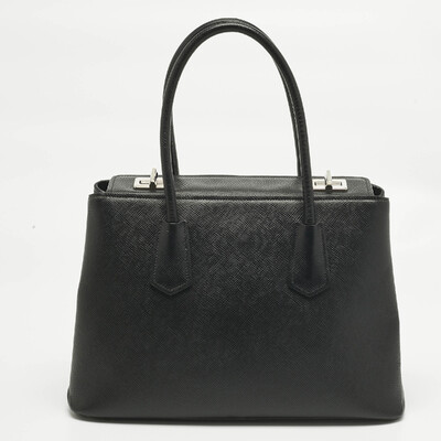 Minimalist elegance defines this Prada tote, crafted from durable black Saffiano Cuir leather. The twin lock closure adds a polished finish to the sleek silhouette.
