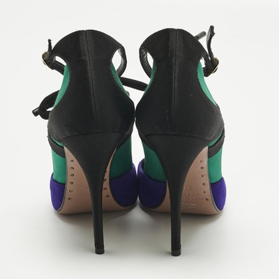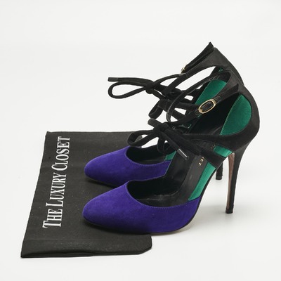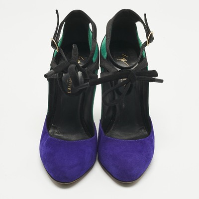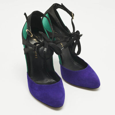 Giuseppe Zanotti’s pumps are a statement in color and texture, blending multicolor suede with plush velvet. The ankle strap adds a secure, feminine touch, while the stiletto heel ensures a striking silhouette. Perfect for making an entrance.