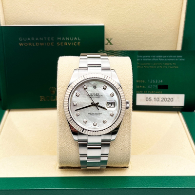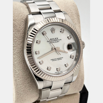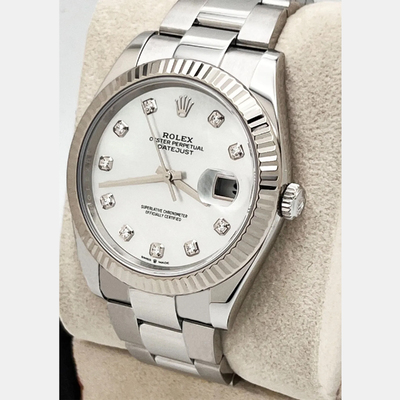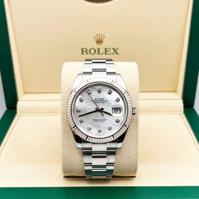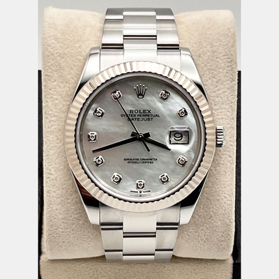 Featuring a radiant mother of pearl dial with diamond accents, the Rolex Datejust 126334 combines elegance with subtle luxury. The 41mm stainless steel and 18K white gold case enhances its luminous appeal, showcasing Rolex’s meticulous craftsmanship and refined design philosophy.