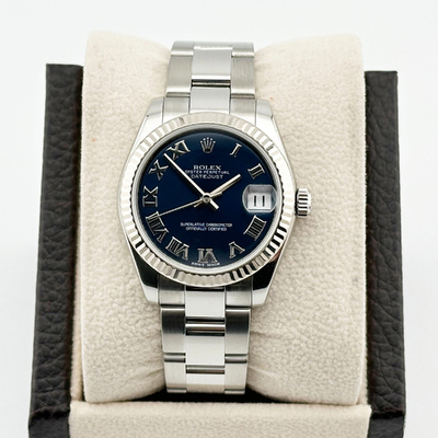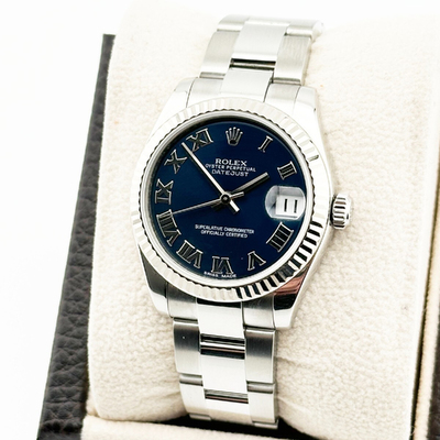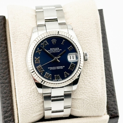 The Rolex Datejust 178274 midsize presents a vivid blue dial set within a stainless steel case, striking a perfect balance between elegance and everyday versatility. Its refined design, combined with Rolex’s iconic craftsmanship, ensures a luxurious, timeless accessory for modern women.