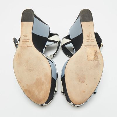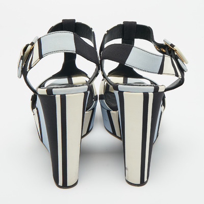 Bright tricolor fabric wraps the foot in these T strap wedges, with a platform that lifts without strain. Casual yet distinctive, they bring a touch of Italian flair to warm weather outfits.