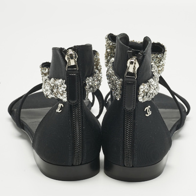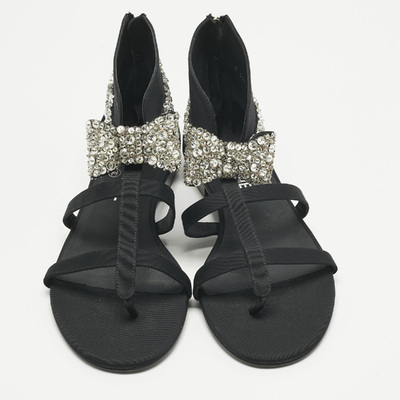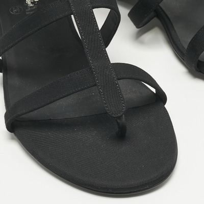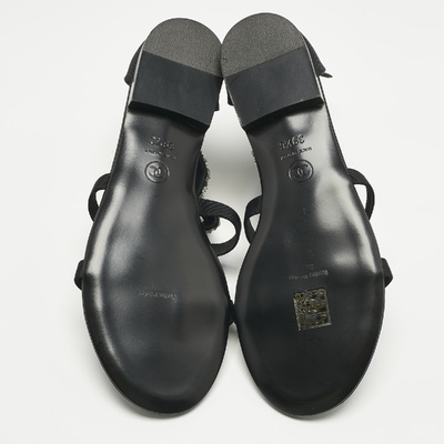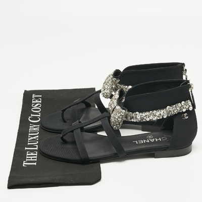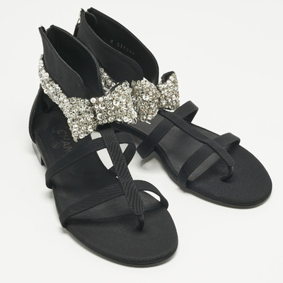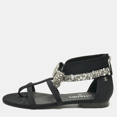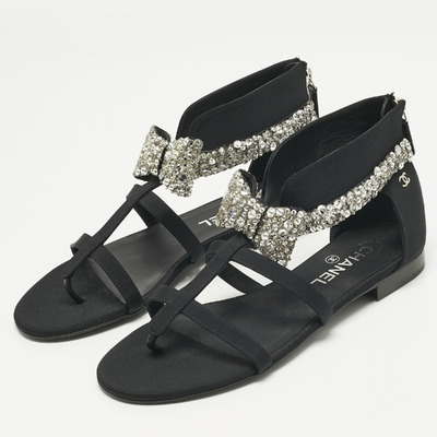 Chanel Black Canvas Crystal Embellished Bow Flat Sandals Size 39.5 1221480 (чёрный, lpn31004805)