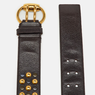 Crafted in dark brown leather, this Gucci belt is accented with metal studs and a bold buckle. The edgy design adds a modern twist to classic tailoring. A versatile accessory for elevating everyday looks.