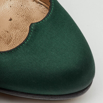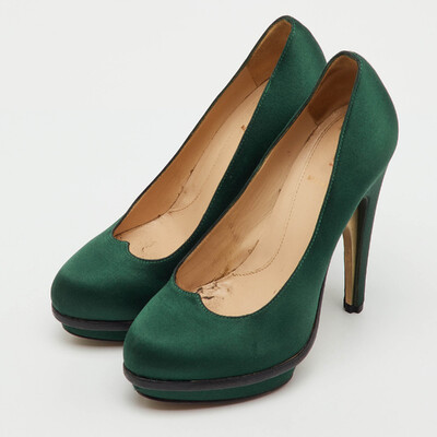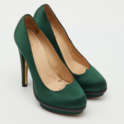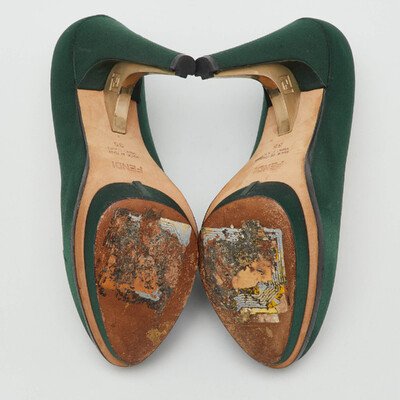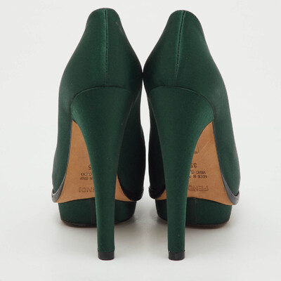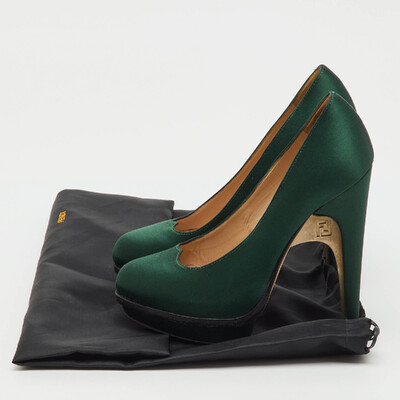 Elegant with a bold twist, these Fendi pumps are crafted from dark green satin. The platform sole and bridge heel create a statement silhouette, balancing height with stability. Perfect for evening occasions with a touch of drama.