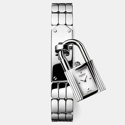 A clever twist on the iconic Hermès Kelly, this mini watch hides within a detachable padlock charm. The silver steel bracelet echoes the Kelly clasp, while the white dial with two hands keeps the design clean and understated. Jewelry and timekeeping meet in one Hermès piece.