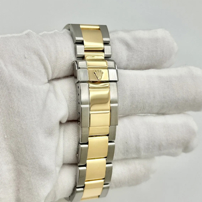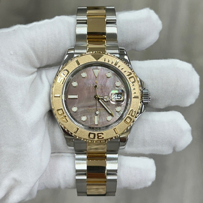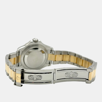 The Rolex Yacht Master 16623 is a striking expression of nautical elegance. Its 40 mm case in stainless steel and 18K yellow gold frames a mesmerizing black mother of pearl dial, a detail that lends rare depth and iridescence. With automatic precision and a design born from seafaring heritage, this timepiece blends sport and sophistication with effortless authority.
