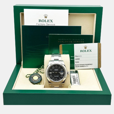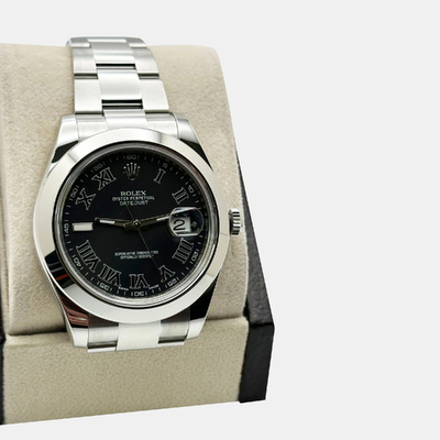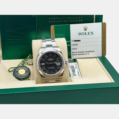 A striking pre owned timepiece, the Datejust II 116300 combines a deep black dial with stainless steel construction. Its 41 mm case and automatic movement deliver precision and a bold wrist presence. Perfect for office wear, evening affairs, or stylish everyday use, this Rolex merges contemporary design with timeless sophistication.