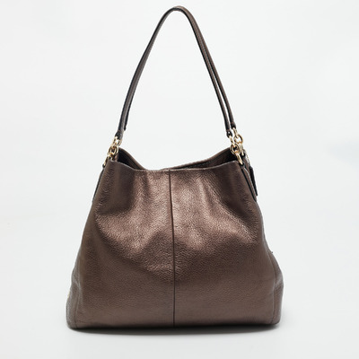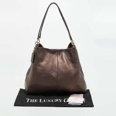 Crafted in warm copper brown leather, the Coach Phoebe Madison shoulder bag combines modern elegance with functional design. Its smooth finish is complemented by polished gold tone hardware and a top handle. The spacious interior keeps essentials organized, making it perfect for everyday sophistication.