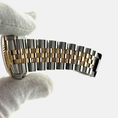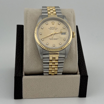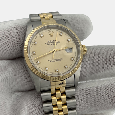 Luxury is redefined with the Datejust 16233, featuring a diamond studded champagne dial framed in 18K yellow gold and stainless steel. Its 36 mm case and automatic movement make it a flawless companion for gala events or prestigious meetings. This pre owned timepiece turns sophistication into an art form.
