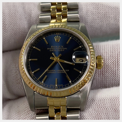 The Datejust 78273 captivates with a blue dial encased in 18K yellow gold and stainless steel, powered by automatic movement. Its 31 mm case makes it perfect for formal affairs, office wear, or elevated casual occasions. A pre owned Rolex that radiates refined luxury and classic style.