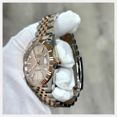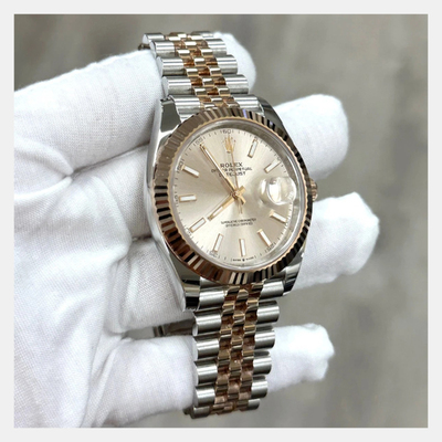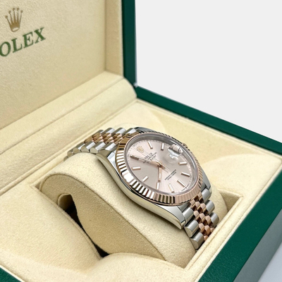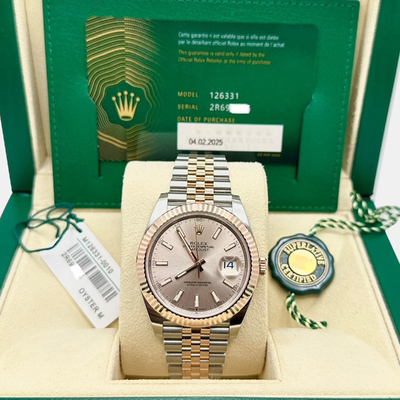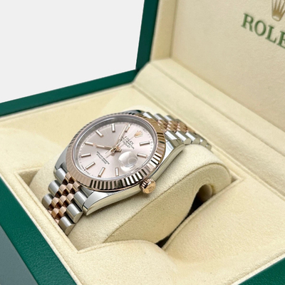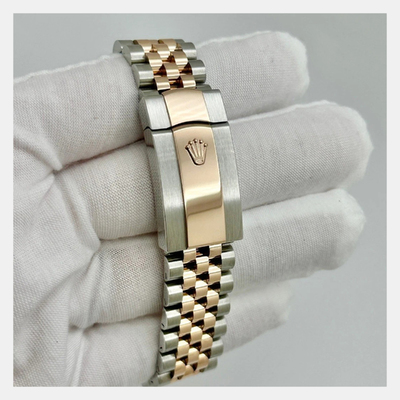 The Datejust 126331 glows with a Sundust dial, perfectly paired with 18K rose gold and stainless steel. Its 41 mm case houses automatic movement, offering flawless precision. Ideal for formal meetings or refined everyday wear, this pre owned Rolex exudes warmth and timeless elegance, making every glance at your wrist a statement of sophistication.