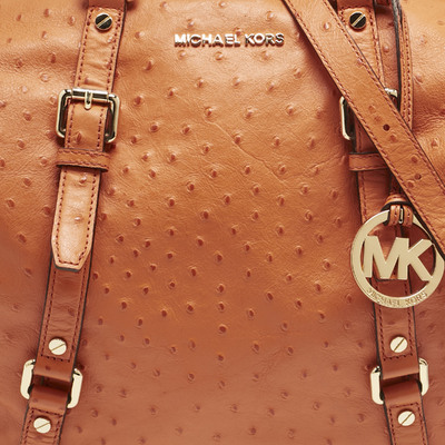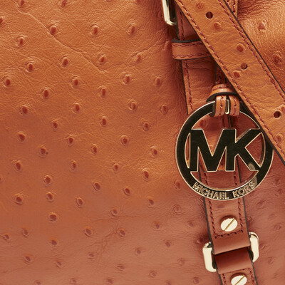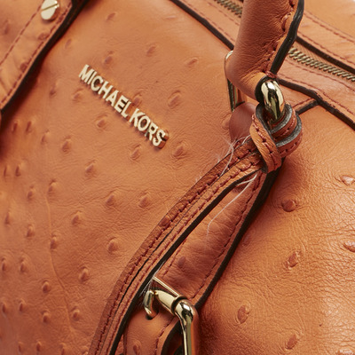 Bold in orange ostrich embossed leather, the Michael Kors Bedford satchel makes a vibrant style statement. The belted detailing enhances its structured design. With spacious compartments and dual handles, it balances standout appeal with everyday functionality.