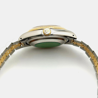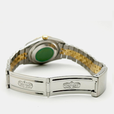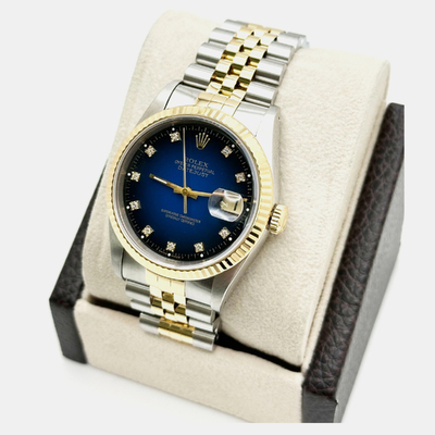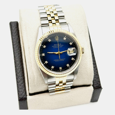 With a mesmerizing blue vignette diamond dial, the Datejust 16233 blends 18K yellow gold and stainless steel in perfect harmony. The 36 mm case and automatic movement create a watch that excels in both precision and presence. Ideal for evening soirees or luxury everyday wear, it radiates elegance at every angle.