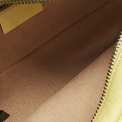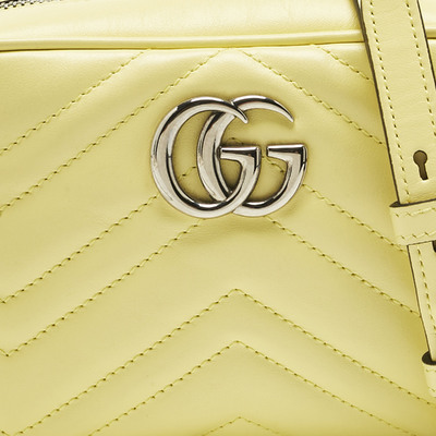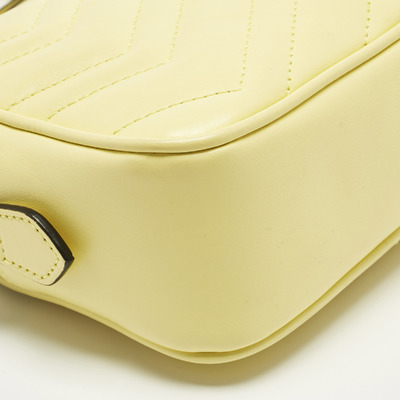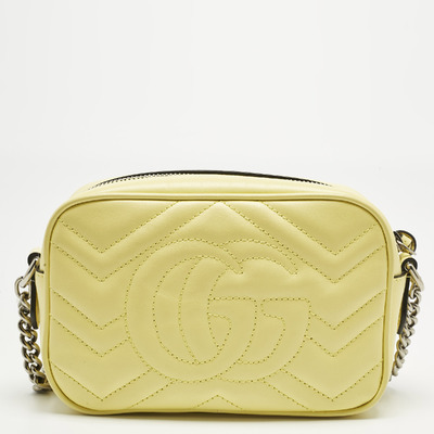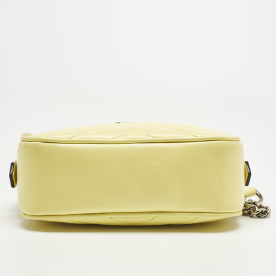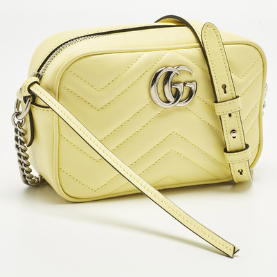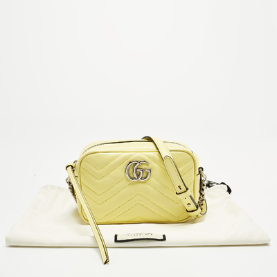 This authentic Gucci Mini GG Marmont Camera Bag, crafted from yellow matelassé leather, adds a bright, joyful touch to any outfit. Its chain and leather strap can be worn over the shoulder or across the body, giving flexibility for day or evening. The GG logo and soft quilting make it unmistakably Gucci.