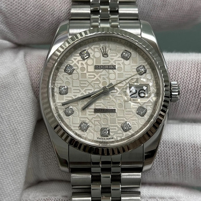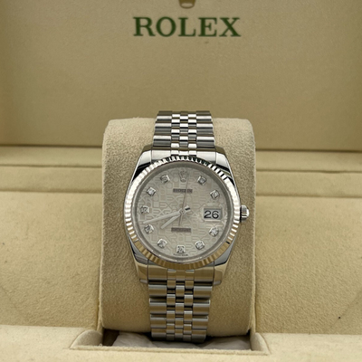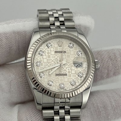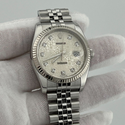 The Rolex Datejust 116234 exemplifies timeless sophistication. Its 36 mm case combines stainless steel with 18k white gold, complemented by a diamond accented dial. Powered by a precise automatic movement, this watch balances elegance and performance, embodying Rolex’s enduring legacy of refinement and craftsmanship.