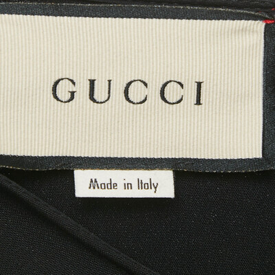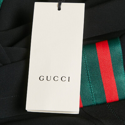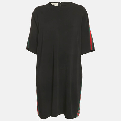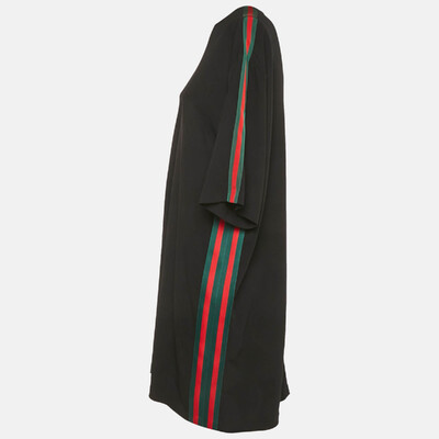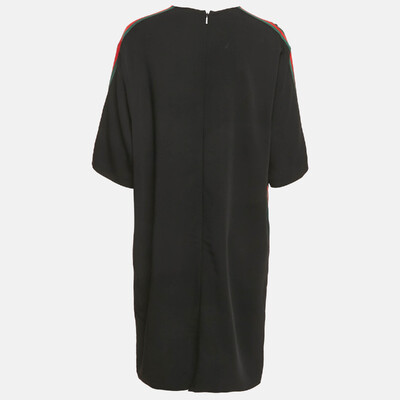 Gucci’s shift dress is cut from luxurious black crepe with signature web trim detailing. Its clean silhouette is both elegant and versatile. A sophisticated wardrobe essential for day to night styling.